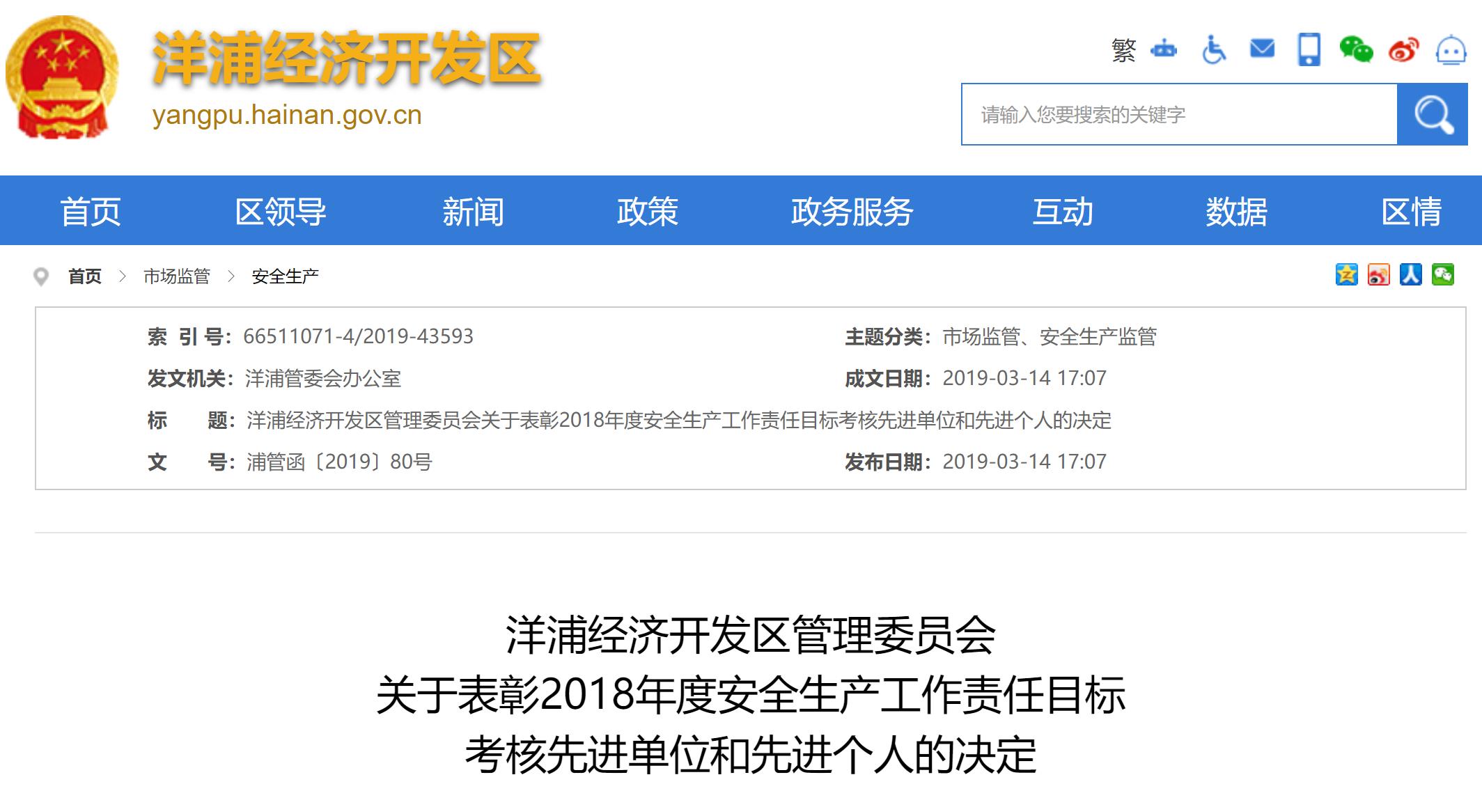 海南公司及三名同事分别被评为区安全目标考核先进单位和先进个人