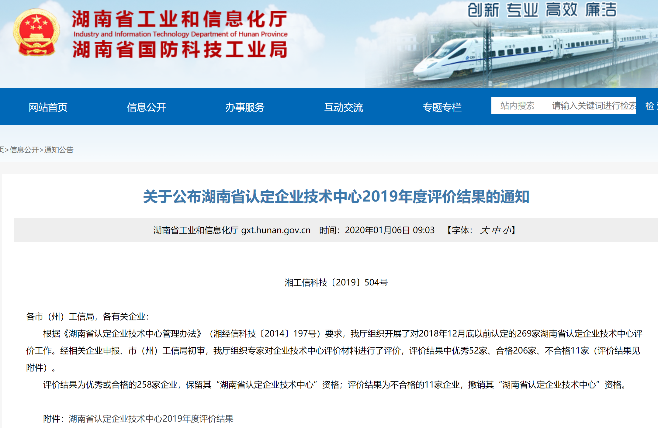 2020年1月6日,湖南省工业和信息化厅发布“关于公布湖南省认定企业技术中心2019年度评价结果的通知”,省工业和信息化厅组织专家对2019年企业技术中心评价材料进行了评价,评价结果中,湖南凯美特气体股份有限公司等52家企业技术中心被评为优秀(见附件第37条)、合格206家、不合格11家。